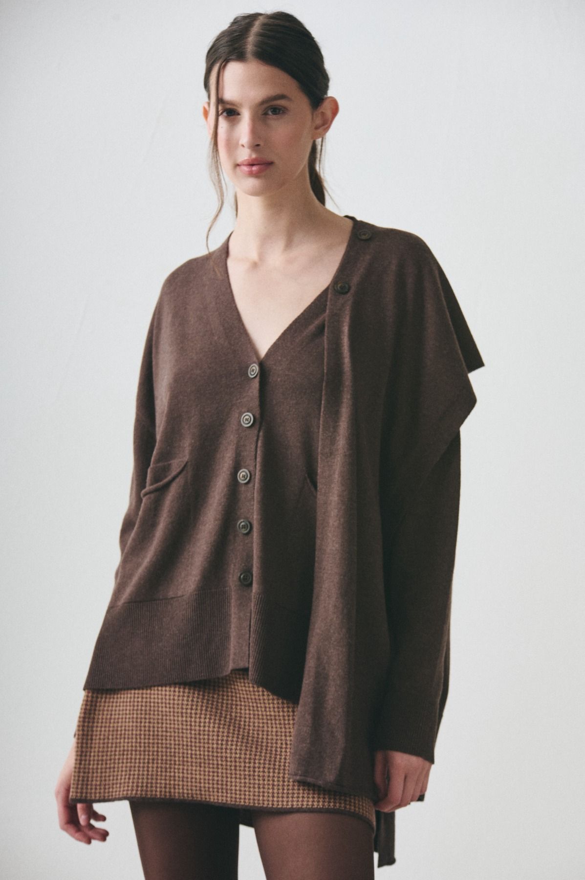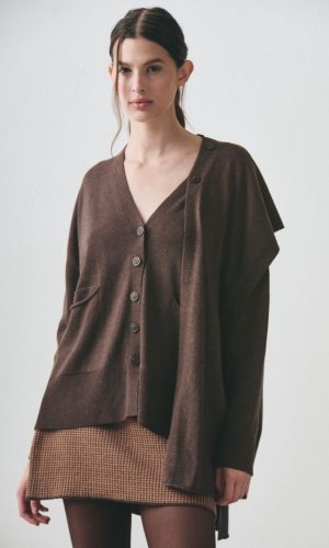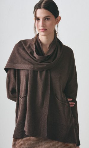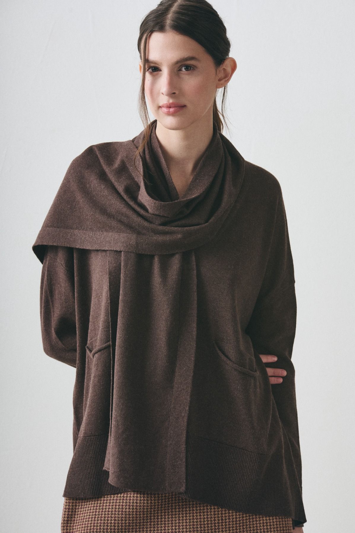 Cárdigan oversize, confeccionado en hilado ultrafino, con bufanda accesoria que suma abrigo y versatilidad al diseño.