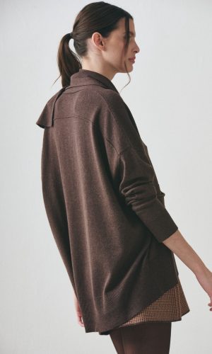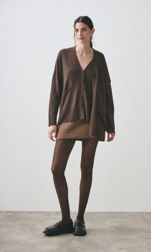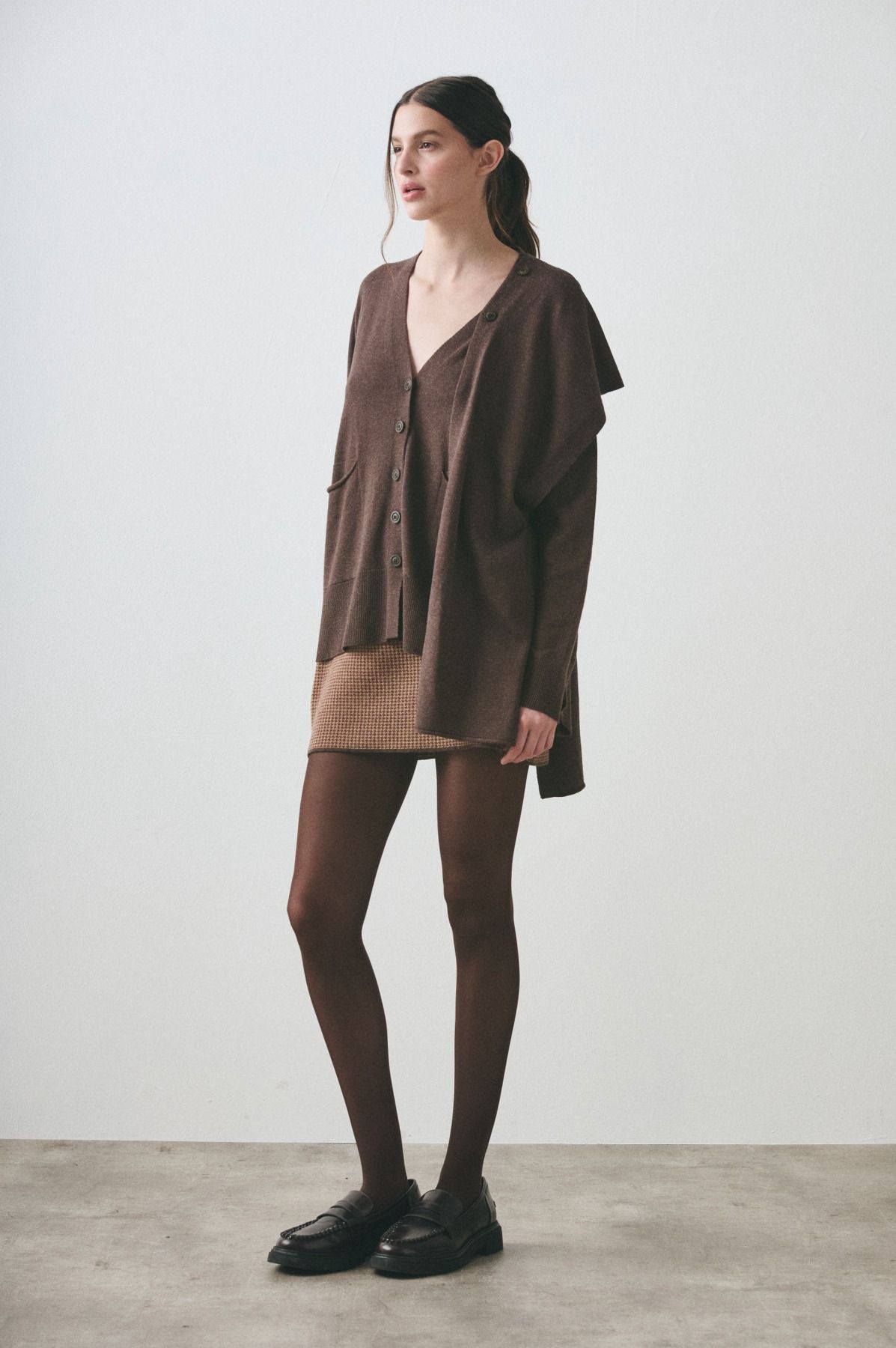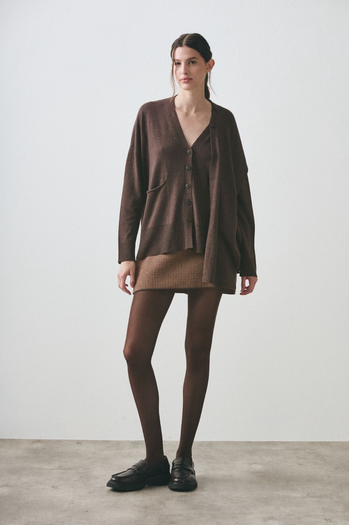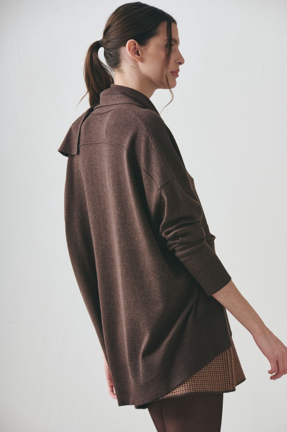 Cárdigan oversize, confeccionado en hilado ultrafino, con bufanda accesoria que suma abrigo y versatilidad al diseño.