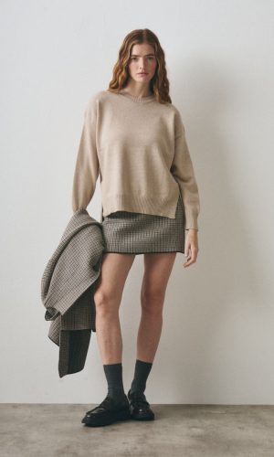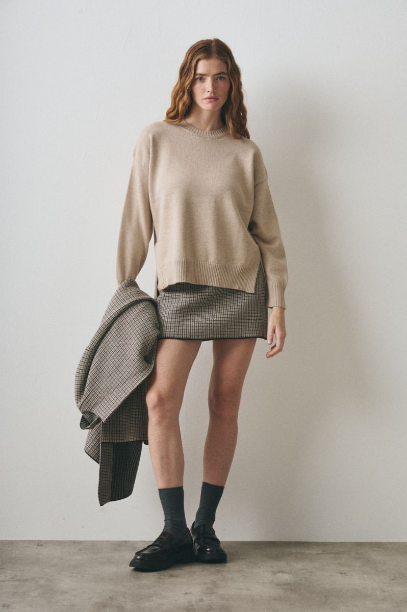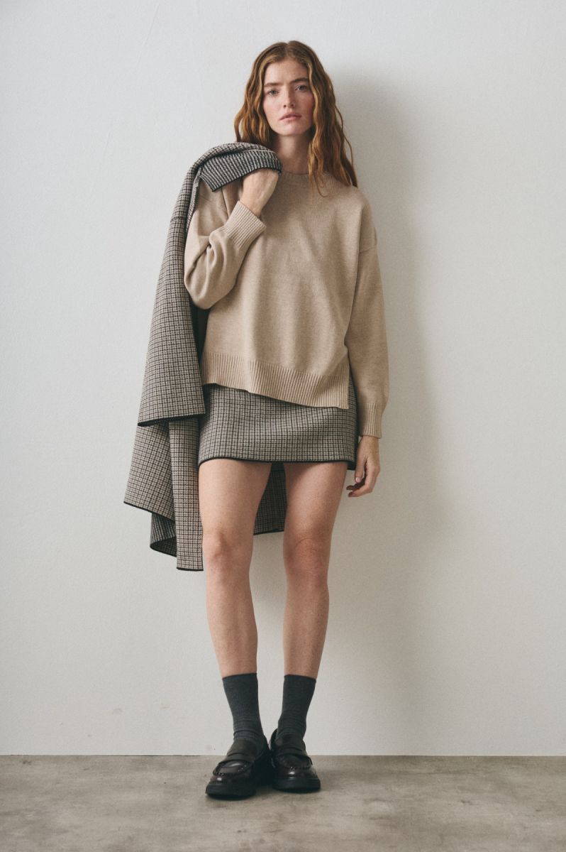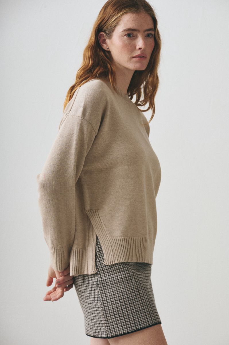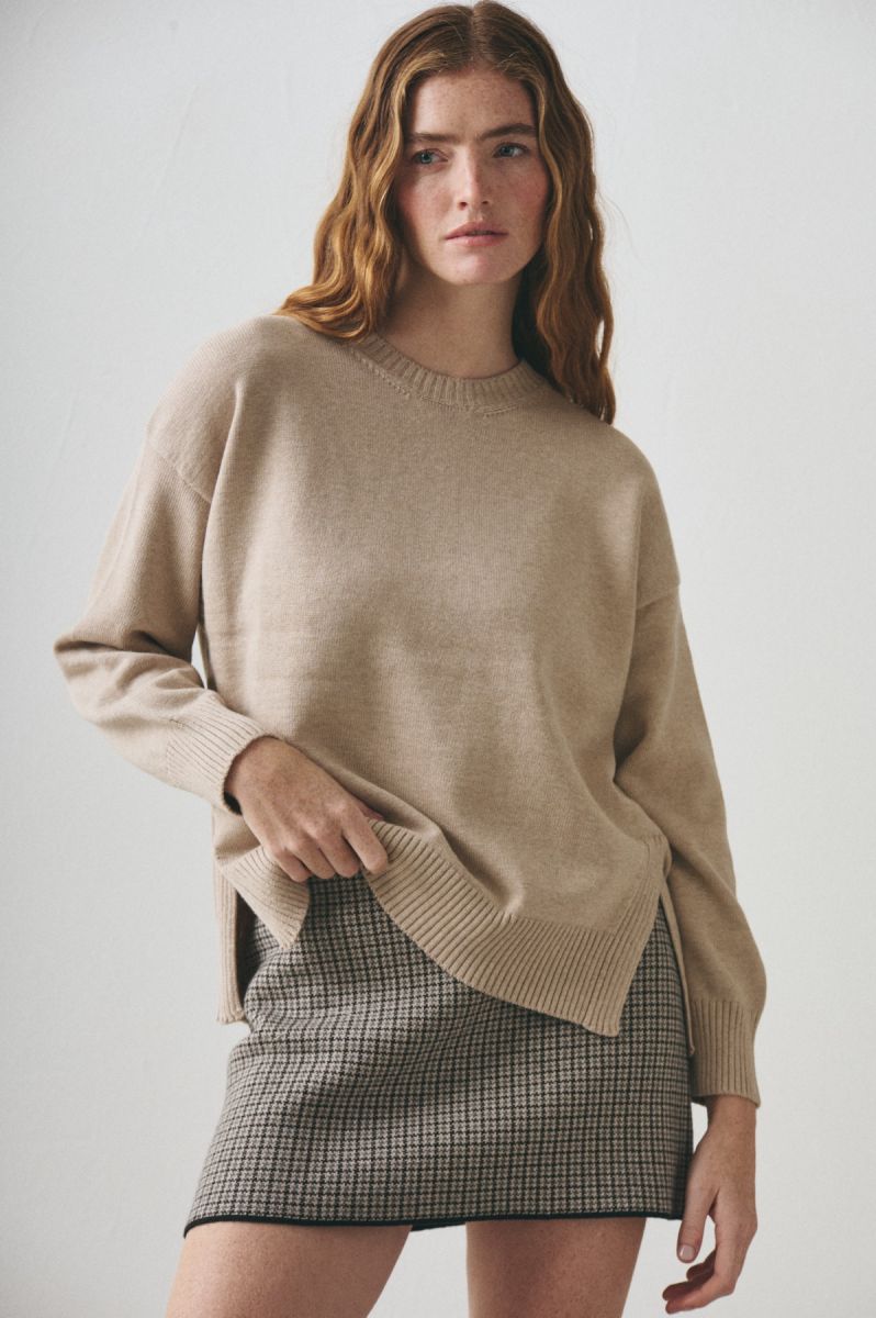 Tejido de grosor intermedio, con fit oversize, cuello redondo y tajos laterales.