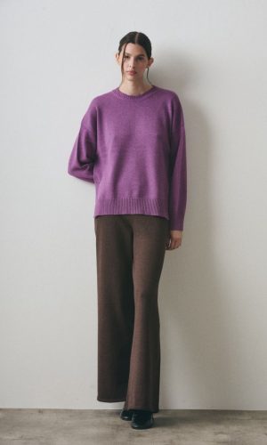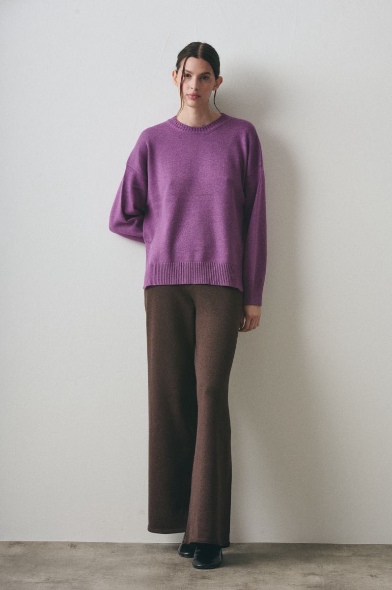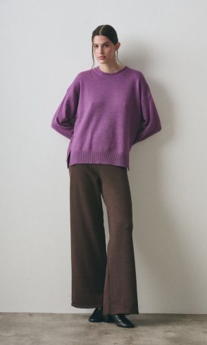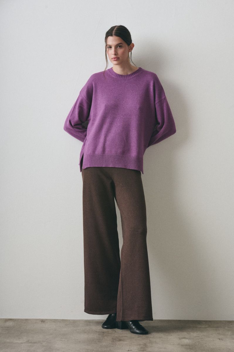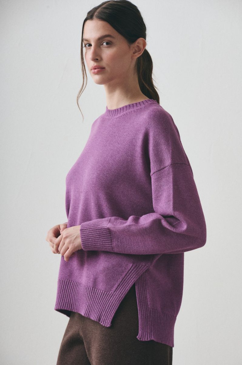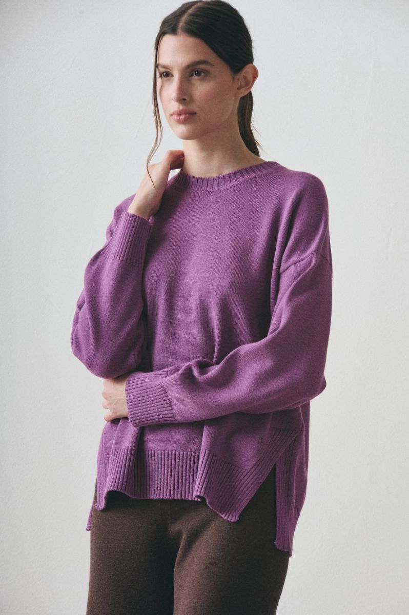 Tejido de grosor intermedio, con fit oversize, cuello redondo y tajos laterales.